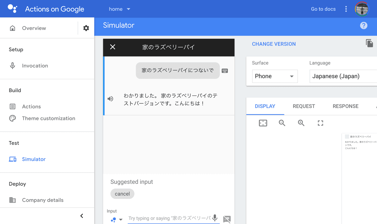 Action on Google に実際に利用する際に使うアプリケーション名を登録したら Simulator を使ってテストをします。これで問題なく実行が出来ていて、開発アカウントと実利用アカウントが同じであれば実機の Google Home でも動作するはずです。