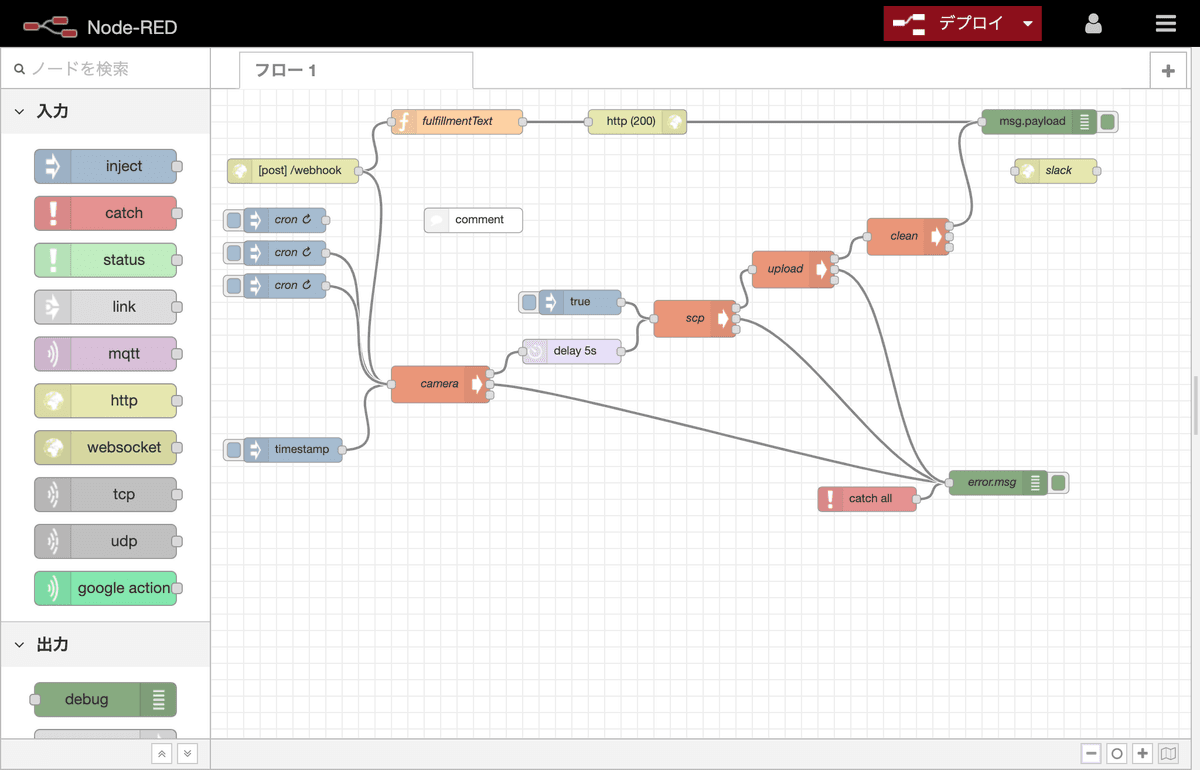 inject node の payload を「日時」に設定することで Cron として利用することが出来ます。 自分の場合は朝夕の 1 時間を 15 分おきにスケジュールで撮影をしています。